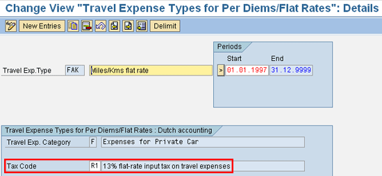 Figure 16 shows the details for expense type FAK. As you can see, tax code R1 is being used for this expense type. If you need to change the tax code, you can either change the tax code and transport this to your production environment or create a new expense type with a start date at the beginning of the new tax rate.