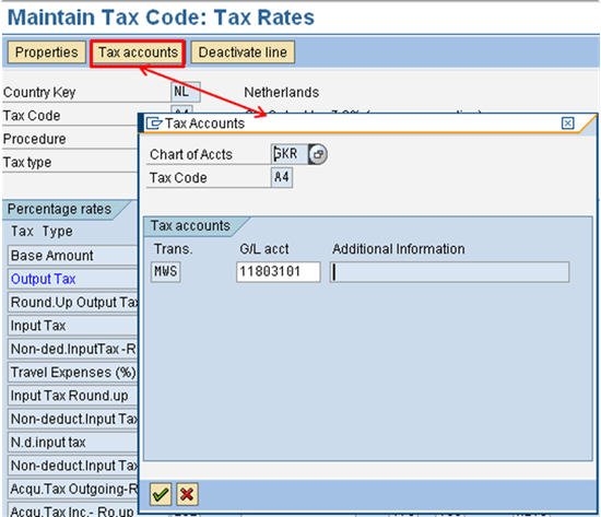 After you click the Tax accounts button, the pop-up screen shown in Figure 2 appears. One disadvantage of using transaction FTXP is that the entries must manually be put in a transport request. However, that is also the standard procedure for tax codes, so the disadvantage is not that great.