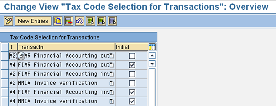 You also can set a default value per functional area. In case you use this functionality, you must adjust these settings as well. The customizing transaction is OBZT. This transaction can be found at several places in the IMG; for example, via menu path Financial Accounting > Accounts Receivable and Accounts Payable > Business Transactions > Incoming Invoices/Credit Memos - Enjoy > Define Tax Code per Transaction. In Figure 3 you see an example for this transaction. All existing VAT codes appear on the list, including the new VAT codes A4 and V4, and the default value has also been changed to the new codes. After you select the settings, click the save icon (not shown in Figure 3) to save your entries.