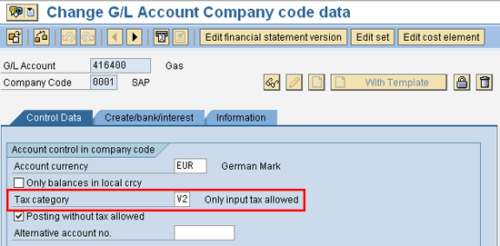 In the general ledger master data no modifications are required unless you use VAT codes in the G/L accounts. When you use a VAT code as a tax classification in the G/L account, you must change this code on the day the new percentage becomes effective. Figure 4 shows an example of how this may look. You use transaction code FSS0 for this step. For example, you can use transaction code S_ALR_87012328 (report RFSKVZ00) to search for G/L accounts having a fixed VAT code. In this transaction you must use the dynamic selection to select on Tax category. This is part of the company code data. You can use transaction FSS0 to change the accounts on the day the change becomes valid. Enter the G/L account number and company code and click the change icon. Change the existing VAT code to the new VAT code and click the save icon. Alternatively, you may use transaction OB_GLACC12 to do a mass change, but users often don’t have authorization for this transaction.