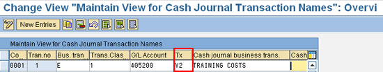 The cash journal is a journal used to manage the postings for cash transactions. The settings for the cash journal may have fixed VAT codes that need to be changed. With transaction FBCJC2 you can maintain the business transactions for cash journals. Follow IMG menu Financial Accounting > Bank Accounting > Business Transactions > Cash Journal > Create, Change, Delete Business Transactions. Figure 8 shows an example of such a business transaction. In this case you assign the tax code V2 to the business transaction for training costs. The best modification is to create a new business transaction for training costs with the new VAT code. However, this can be very confusing for users. Therefore, a better solution is to change the VAT code and transport the change to the production environment at the date the new VAT rate becomes valid.