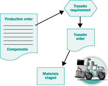 The material staging process: (1) The required components in the production order are placed in a transfer requirement. (2) The transfer requirement is converted into a transfer order, (3) which tells the warehouse what materials to stage.