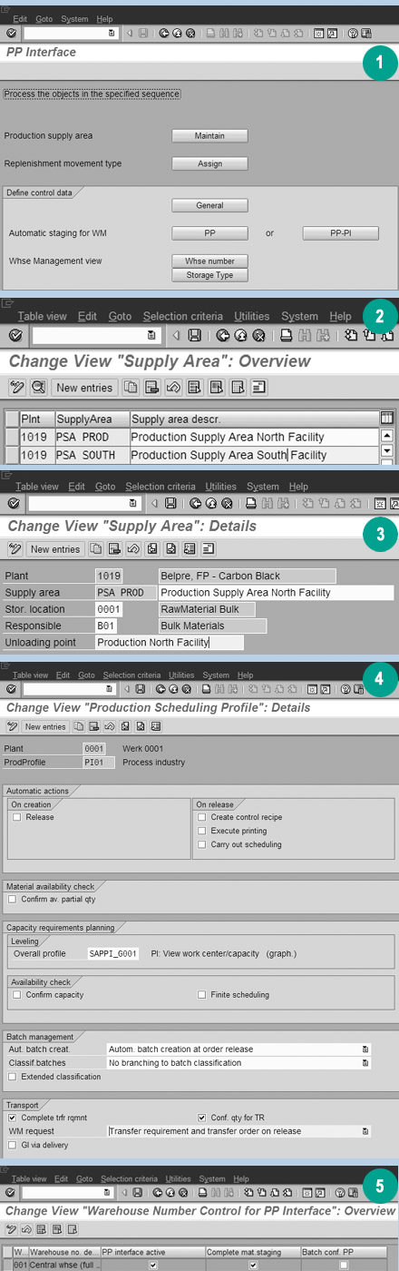 WM-PP interface configuration. (1, 2, 3) Maintain PSAs. (4) Activate the creation of TRs at release or at creation (WM request). (5) Activate the PP interface for the warehouse.
