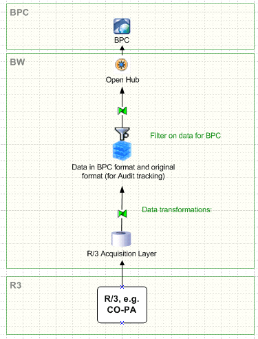 You can plug SAP NetWeaver BW and SAP BusinessObjects Planning and Consolidation, version for the Microsoft platform together using the open hub service and Microsoft SQL Server Integration Services (SSIS). SAP NetWeaver BW and SAP BusinessObjects Planning and Consolidation Data Manager can take over the role of the transformer to ensure that the SAP data loaded into SAP BusinessObjects Planning and Consolidation is correct and reflective of what the user expects.