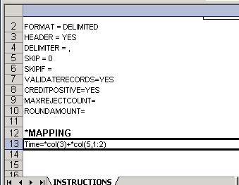 The syntax *col(3)+*col(5,1:2) concatenates 2009 and 05 from the above example into the value 200905. The value 200905 can be passed to a conversion file, which then converts it to the value 2009.MAY.