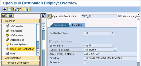 The open hub destination to transfer SAP NetWeaver BW data to a .csv file
