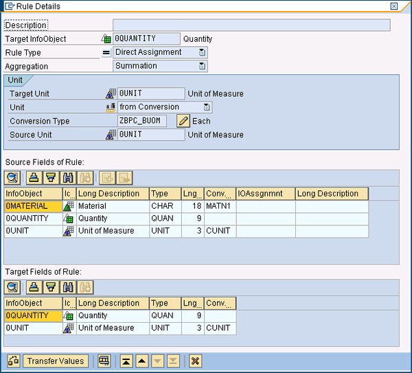 Now, how do you handle different key figure types? For SAP BusinessObjects Planning and Consolidation, you need to transfer the quantity key figure to your one key figure as well. However, 0AMOUNT is a key figure of type currency in SAP NetWeaver BW (i.e., you cannot write any quantity value into it). Therefore, in the quantity rule group of transformation, you transfer the source quantity 0QUANTITY into the quantity key figure ZBPC_QTY. In the end routine, you transfer 0AMOUNT and ZBPC_QTY into a characteristic ZBPCAMNT, which is of type CHAR (Figure 6).