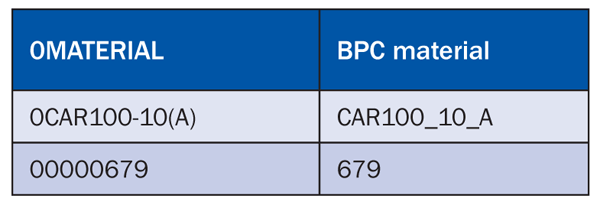SAP BusinessObjects Planning and Consolidation dimension IDs do not accept certain special characters such as a dash or parentheses. These special characters, however, can be found in SAP ERP source data. A prominent example of an object that often contains special characters is the alphanumeric material number in SAP ERP, which is stored in the SAP NetWeaver BW InfoObject 0MATERIAL to represent the stock keeping unit (SKU), as shown in Table 15.