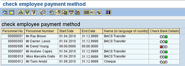 - Yellow: The employee is set up with a temporary check payment method that needs to be followed up and replaced by a permanent direct bank transfer record.
