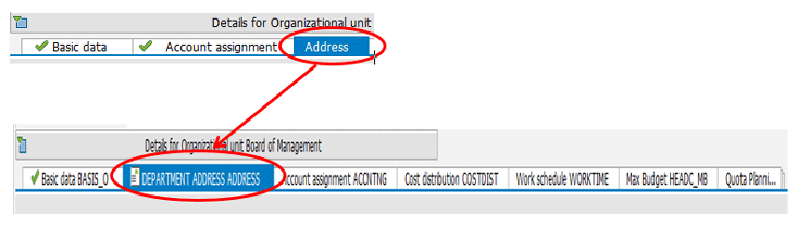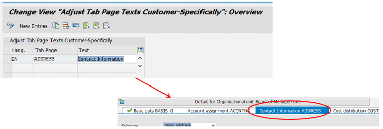 Make an entry in view T77OCTABST with the technical name of the tab page (ADDRESS in this case) and a new description (Contact Information). The alternative SPRO path for this step is Personnel Management > Organizational Management > Hierarchy Framework > Adjust Tab Pages in Detail Area > Change Text and Icons on a Tab Page > Change Tab Page Text in all Tab Page Groups (