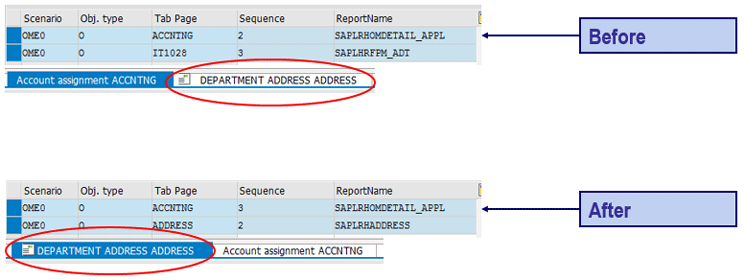 You can also change the sequence of the tab pages in the details area. Copy the entries of the respective columns (e.g., the columns for which you want to switch the order) from the T77OMTABUS view and paste them into the T77OCTABUS view. Or follow SPRO menu path Personnel Management > Organizational Management > Hierarchy Framework > Adjust Tab Pages in Detail Area > Change the Tab Page Sequence. You should specify the respective hierarchy framework scenario and object type along with the tab page name.