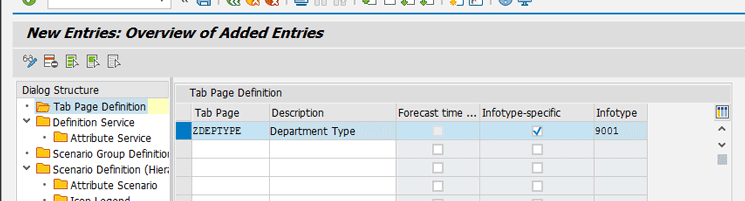 Figure 11). The Tab Page Definition screen on the right opens where you can insert the relevant entry by selecting the Infotype-specific check box next to it. In this example, the customer-specific infotype 9001 (Department Type) is inserted as a tab page. Then click the save icon to save your new entries.