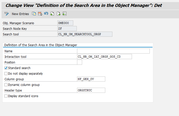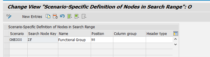 The next step is to adjust the search area. In view T77CNODORD, click the New Entries button to insert an entry that includes the object manager scenario and the Search Node Key (