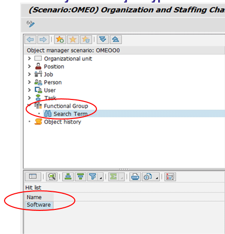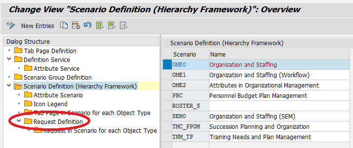 To see the technical name of the hierarchy framework scenario, launch transaction code PPOME. The technical name is presented in the title; in this case, it is (Scenario:OME0), circled in red in