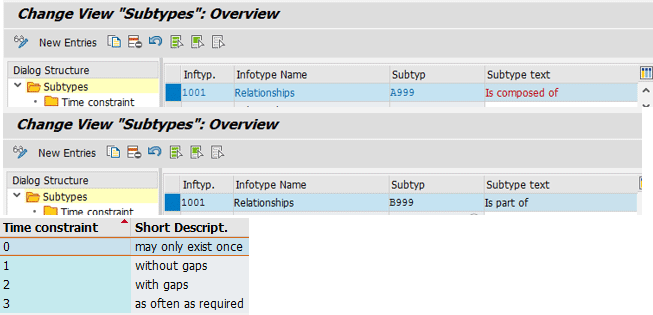 Figure 32, the relationship between the functional group and organizational unit is being created. Using the new entries, button entries for 1001 – A099 and 1001 – B099 should be inserted. Select an infotype and subtype on the right, and then double-click the Time constraint folder on the left to maintain the time constraint information. (Some of the available time constraint values are shown at the bottom of