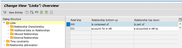 Figure 33), double-click the Links folder on the left and then click the New Entries button to insert an entry for the new relationship in the screen that opens on the right. (The alternative SPRO path for this step is Personnel Management > Organizational Management > Basic Settings > Data Model Enhancement > Relationship Maintenance > Maintain Relationship.)