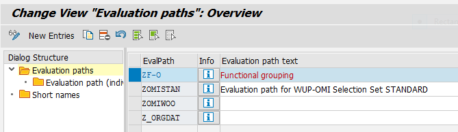 An evaluation path is simply a chain of relationships between the objects in a hierarchical structure. To create an evaluation path, go to the view T77AT (which can be accessed directly via transaction code OOAW). (The alternative SPRO path for this step is Personnel Management > Organizational Management > Basic Settings > Maintain Evaluation Paths.) In the screen that opens (