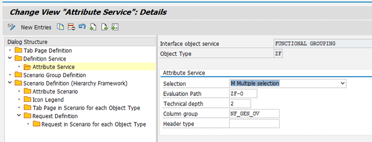 Figure 38, select the newly created service from the right and double-click the Attribute Service folder on the left. In the screen that opens on the right, specify all of the technical attributes (including evaluation path, technical depth, and column group) accordingly.