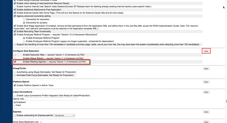2. Once in Company Settings, scroll down to the Configure Goal Execution section (Figure 2). Click the Enable Meeting Agenda – requires “Version 11 UI framework (ULTRA)” check box and then click the Save button on the right.