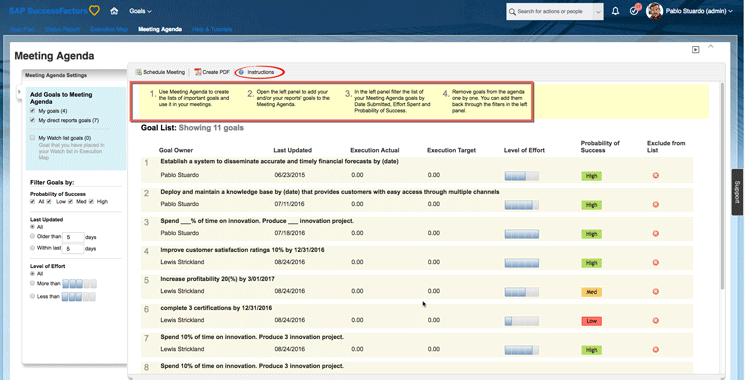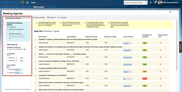 The SAP SuccessFactors Meeting Agenda feature, although simple, is a useful tool that greatly enhances user experience and encourages users to use the system by letting them select goals based on different criteria, create PDFs of goals, schedule meetings, and send email invitations to team members. Using this tool allows users to schedule meetings documenting team’s goals in an easier and more standardized way.