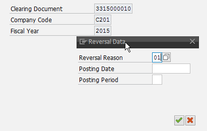 Figure 2) asking for the reversal reason and the posting date that you can enter in case you don’t want to use the same one as the payment document. Click the enter icon (the green check mark) after you enter a value in the Reversal Reason field (e.g., 01 - Reversal in current period).