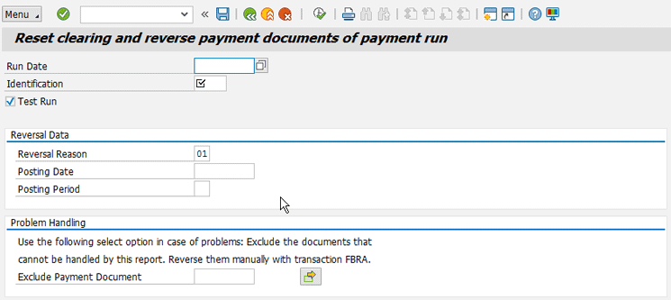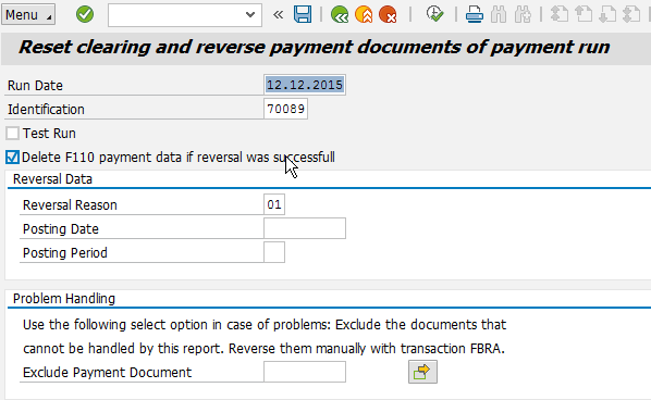 Once in a while you need to reverse the payment documents generated by a payment run (transaction code F110). The need to reverse a payment run may be the result of many circumstances. You may have entered the wrong posting date. You may have put the due date too far in the future so that you are paying more than is needed. You may have realized that you took the wrong house bank, and there is not enough money in your bank account. You may have used the wrong customizing settings.