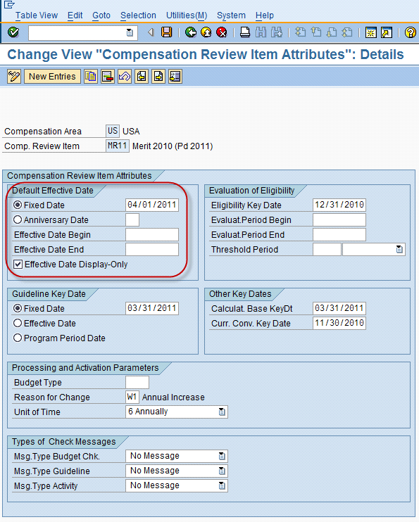 Each compensation review item has an associated date on which the compensation element is effective (i.e., the date on which the payroll-relevant infotype records such as infotype 0008 [basic pay] and infotype 0015 [additional payments] update). The effective date of infotype 0759 (compensation process) is defined at the compensation review item level (see tip 2). Figure 3 highlights the section within the compensation review item that contains the default effective date configuration.
