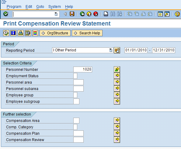 The CRS typically links pay to performance. This is the document that managers use for their annual pay discussions with employees. The statement is usually personalized and many times contains relevant information for employees to describe their payments (e.g., merit components, bonus segment calculations, or LTI breakdowns). In the SAP system, the form is rendered using SmartForm technology. The standard SmartForm name is HR_ECM_CRS. You should copy this form into your user namespace and enhance it accordingly. Standard transaction PECM_PRINT_CRS provides the ability to print compensation review statements on the back end (Figure 6). Be sure to create an entry in TVARV and use a program variant to call the custom name of your SmartForm. By doing this, the program knows which enhanced SmartForm template to render in lieu of the standard.