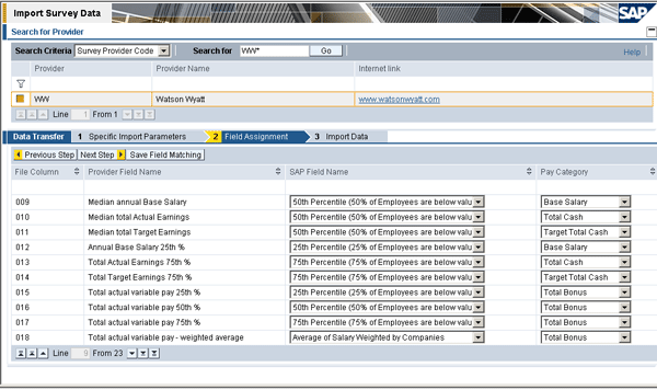 Whenever a new file is imported into the system, a compensation professional needs to map the SAP internal data fields to the fields of the salary survey (Figure 8). Once these fields are mapped, future imports do not need to be re-mapped unless a data field changes position or is dropped from the market data, or if the file format or layout changes in some other fashion.