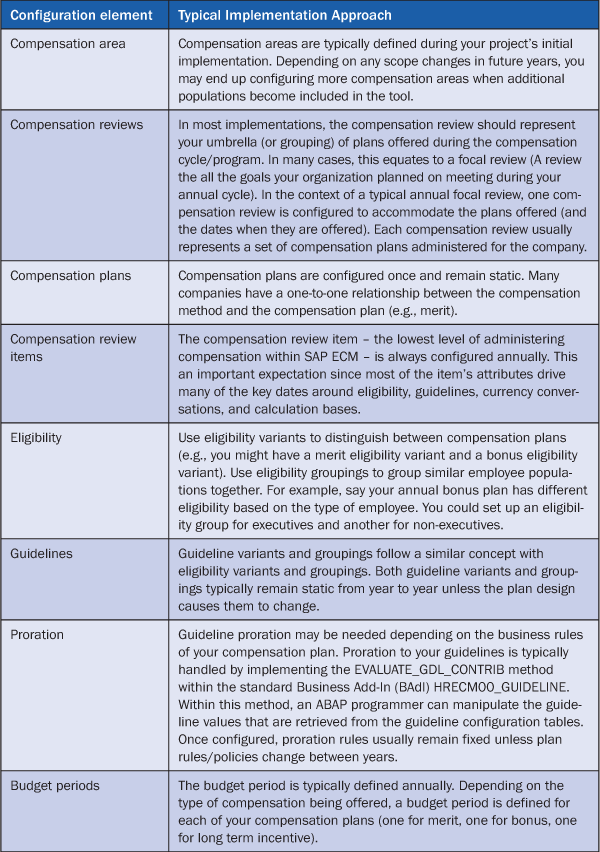 Configuration within ECM is distinguished between annual versus one time, or static. Annual configuration includes elements such as compensation reviews, compensation review items, and budget periods. However, other elements such as compensation areas, compensation plans, and budget types should remain relatively fixed from year to year. Table 1 gives you a quick look at some of the basic configuration elements.