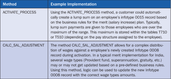 You most likely will implement BAdI HRECM00_ACTIVATION for activation. Activation is the process of creating the payroll-relevant infotype records from the approved planning records — infotype 0008 (basic pay) for merit, infotype 0015 (additional payments) for annual incentive, and infotype 0761 (LTI granting). The logic within this user exit is triggered when changing an employee’s infotype 0759 record status from approved to active using program PECM_CHANGE_STATUS. This BAdI has two methods: ACTIVATE_PROCESS and CALC_SAL_ADJUSTMENT. The ACTIVATE_PROCESS method allows you to revise or create a secondary infotype during activation (for example, by creating or updating a user-specific infotype). With the CALC_SAL_ADJUSTMENT method, you can define an alternative algorithm for evaluating an employee’s new infotype 0008 record. Both methods are commonly implemented. Table 2 shows a simple example of how each method of this BAdI might be used.