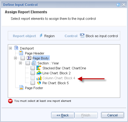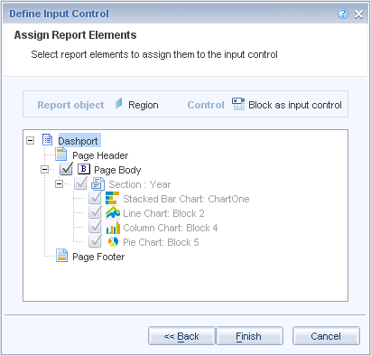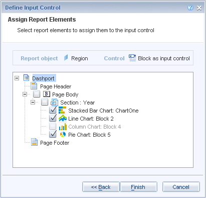 After performing the four steps above, you’ll be taken to the Define Input Control window used for selecting the report object or objects to be used as the filtering object and passed to dependency charts. From here, you’ll have two options for selecting the filtering object: