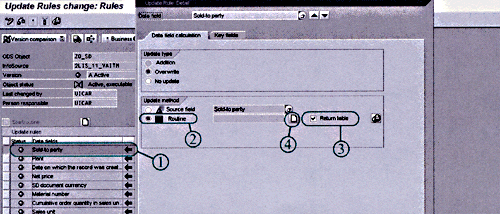 To create an update routine template with return tables, (1) highlight and double-click on the first step under Update rules (Sold-to party, in this case), (2) select Routine and (3) Return table options, and (4) click on the create/modify icon.