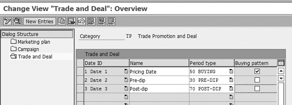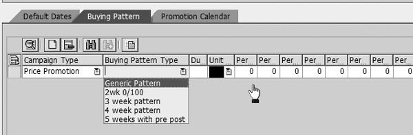 A KAM must enter a buying pattern into the trade promotion manually. The rule is one set of default date assignments per customer and campaign type combination, although you can have many possible buying pattern schemes. After you select the buying pattern type, the KAM enters a duration and then a set of percentages based on the duration. You must remember three things when establishing default buying patterns: