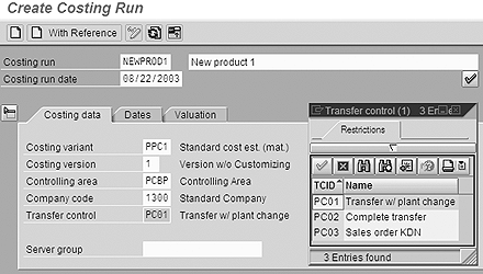 R/3 provides standard functionality called transfer control, which allows transfer of existing component cost estimates to new product cost estimates. You can enter transfer control in the initial screen when a costing run is created with transaction code CK40N, as shown in Figure 1.