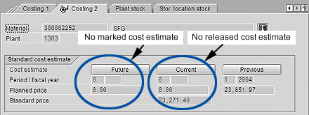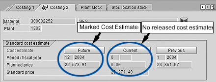 - A marked cost estimate with a start date within the current fiscal period. When a standard cost is released, it moves from the Future standard cost estimate to the Current standard cost estimate column of the Costing 2 view of the material master. Any inventory is revalued and accounting documents are generated at this time. Standard cost estimates can only be released once in any fiscal period for any given material.