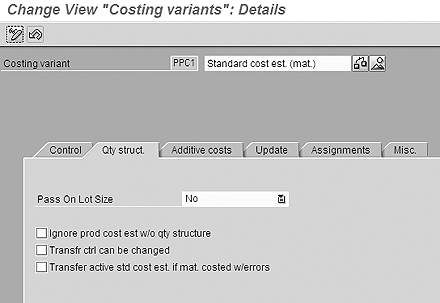 Figure 2 shows the Control tab for costing variant configuration (transaction OKKN), which indicates the transfer control that will be defaulted into the header information when creating a costing run. Figure 3 shows the Qty struct. tab of costing variant configuration, which controls whether transfer control can be changed when creating a costing run using the Transfr ctrl can be changed option. The field appears white if it can be changed, and if it can't be changed, it appears gray in the general data section of the costing run.