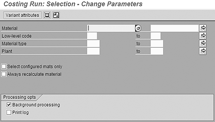 - Leave all fields in the selection screen in Figure 5 blank except for Plant. This has a similar effect as option 1. The difference is that materials both in and not in BOMs in the plant are chosen. This may lead to many costing run messages, as materials not in BOMs that do not require cost estimates are included in the costing run.