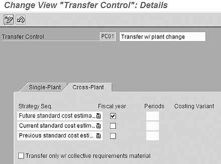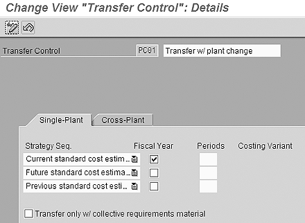 Separate plants can have different people responsible for costing. A cost accountant executing a costing run in one plant may want to create all new cost estimates within his own plant. If any components are sourced from another plant, however, he may want to use existing cost estimates. This is a typical scenario requiring the use of different search strategies for the Single-Plant and Cross-Plant tabs. You can use transaction CKC1 (check costing variant) to check the existing setup of transfer control for a particular costing variant.
