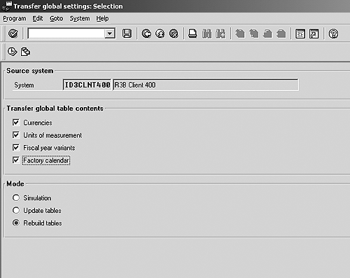 Any of these global settings that exist in your R/3 system should be transferred to BW. For the initial transfer, you should select all four items. You have three modes that you can use to bring each of these items into BW: