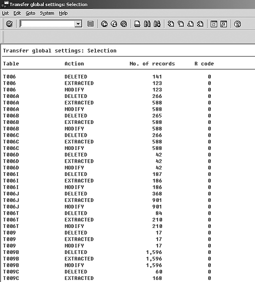 Because you are using the Rebuild tables mode, you can see that each table was first deleted before being populated by the source data that was extracted from R/3. If you had used the Update tables mode, each table would only show an Extracted line and a Modify line. Notice that the return code for each process is 0, indicating a successful transfer.