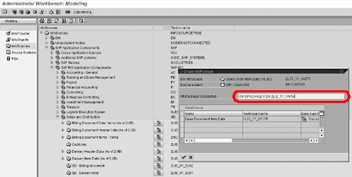 I’ll start with the InfoPackage creation procedure. On the Administrator Workbench, you may select Modeling>InfoSources. Locate the DataSource 2LIS_11_VAITM, right-click on it, and select the Create InfoPackage option (Figure 1). After giving a description to the new InfoPackage (Figure 2), press the enter key to access the InfoPackage definition screens.