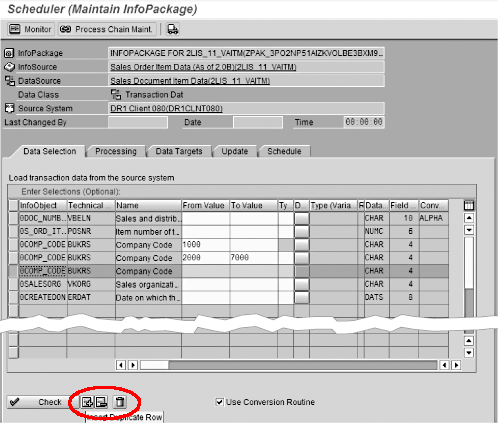Once you select a field, you can create multiple values or ranges, remove extra selection lines, or erase all values from the selection options using the three circled icons, respectively. The Check button validates the values. Note the Use Conversion Routine indicator to the right of the icons.