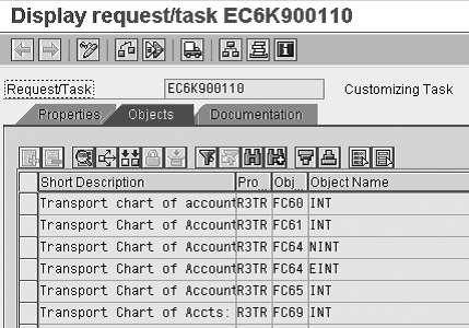 The screen shows two lines under the term Modifiable: the transport request and its underlying task. Double-click on the words Customizing Task to get to the object list (Figure 4). The object list contains all of the objects that are included in the transport. The objects with object name INT contain information about the chart of accounts INT and about the general data of the G/L accounts. Object NINT contains the description of the G/L accounts in Dutch (language code N) and object EINT contains the description of the G/L accounts in English (language code E).