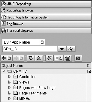 Close all active browser sessions and test the BSP application. Launch transaction SE80 and select BSP Application from the Repository Browser (Figure 12). Type CRM_IC into the field and click on the display icon.