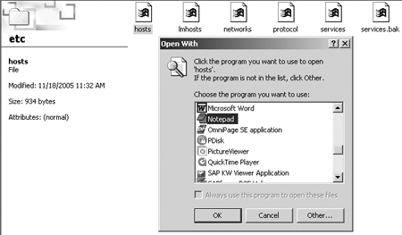 Windows 2000 is the operating system (OS) I used in this example. The file name for hosts depends on the OS used in your particular scenario. For example, the directory for a Windows XP OS is C:/WINDOWS/ system32/drivers/etc.