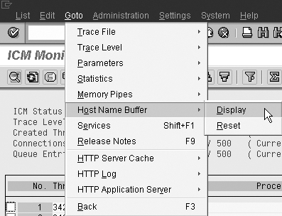 The default setting for the hosts file typically has a reference only for one server address known as the localhost so you must add your particular address and hostname to this file. Access transaction SMICM in a separate session. You can use this transaction to monitor and administer Internet Communication Manager (ICM), which handles all inbound and outbound connections to Web AS and is responsible for send/receive requests to and from the Internet. Now select Goto>Hostname Buffer>Display from the menu area (Figure 8) to find the appropriate settings for the hostname.