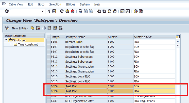 Each infotype stores basic information, such as an object or relation. A subtype is used to store the related set of information corresponding to each object. For example, infotype 5326 is used to store test plan data inside SAP Process Control.
