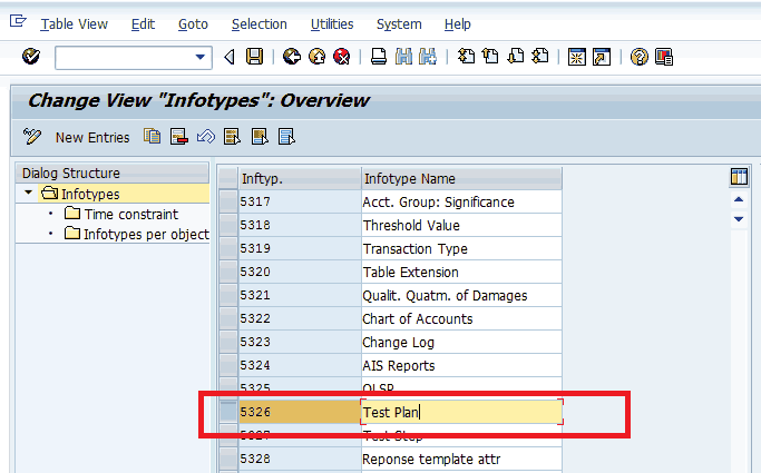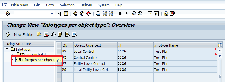 In Figure 3 select any infotype. In my example, I selected infotype 5326 (Test Plan). After selecting infotype 5326, click the Infotypes per object folder. This action displays the screen shown in Figure 4. Note that according to the infotype that I selected in my example, Figure 4 indicates that Local Control, Central Control, Entity-Level Control, and Local Entity-Level Ctrl. need to be configured for infotype 5326.