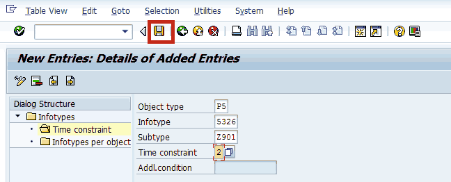 To define a subtype for the local control object type, click the Time constraint folder as shown in Figure 5. To create a new entry, populate the fields as shown in Figure 6. In my example, I enter P2 (local control) in the Object type field, 5326 (test plan information) in the Infotype field, and Z901 (the new regulation that I want to configure) in the Subtype field. In the Time constraint field, enter 2. Process Control data is stored with the time constraint 2. Click the save icon to save your entries.
